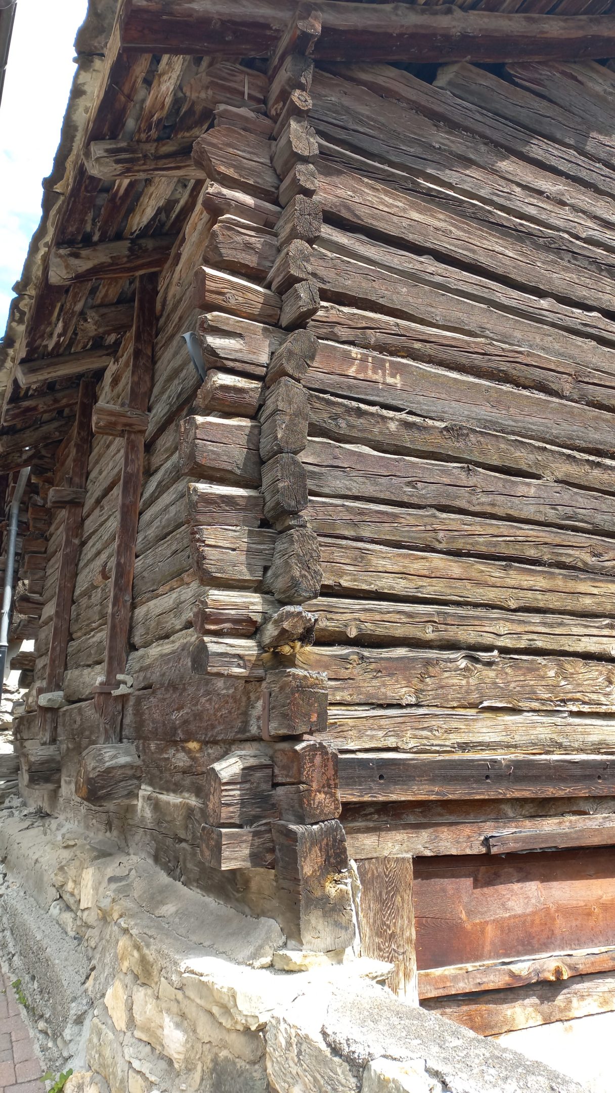 Die Fassaden bestehen aus Holzbalken (Lärche) und die Dachrinnen aus Lärche. Das Fundament sowie die Nordfassade bestehen aus Bruchsteinmauerwerk. Letztere ist manchmal mit Kalkputz verputzt. Wie bei der Typologie der Gebäude im Aostatal besteht das Dach aus Schiefer und die Pfosten der Geländer sind diagonal angeordnet. Aus Gründen der Stabilität sind die Holzbalken in den Ecken gekreuzt und ragen über die Fassade hinaus (tsavaches).