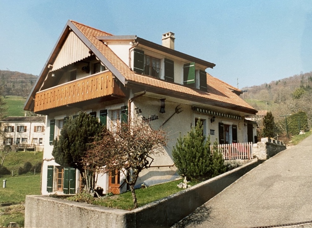 - La façade Sud-Ouest principale représente la typologie du Lieu. Elle est constituée d‘un balcon avec des balustrades en bois sculptées, d’un pignon fermé avec du lattage et les encadrements des ouvertures sont en molasse (fenêtres du rez-de-chaussée).